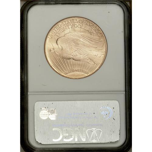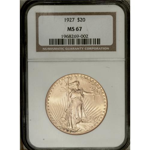 <B>1927<$20> MS67 NGC.</B></I> This coin is frosty rather than satiny, with radiant cartwheel luster bursting forth from each side. The plenitude of 1927 double eagles, even in extremely high Mint State grades such as the present example, ensures a good supply--for a price--of exceedingly lovely examples of this most glorious of U.S. type coins. However, Superb Gem specimens such as this example push the upper bounds of certified examples, as there are currently none finer at either NGC or PCGS. Census: 24 in 67, 0 finer (7/06).<BR><I>From The Ron W. Keeney Collection, Part Two.</B></I>