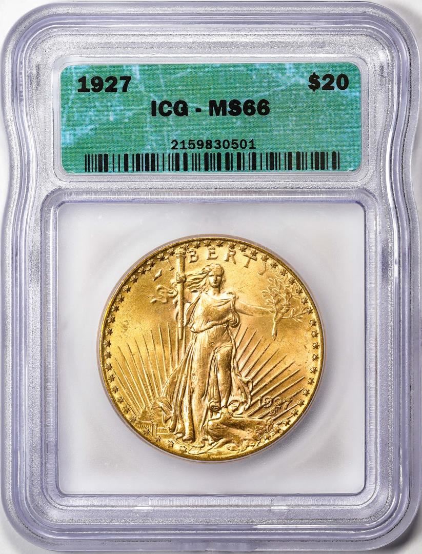 One 1927 $20 Saint Gaudens Double Eagle Gold Coin ICG MS66. ICG Certified.