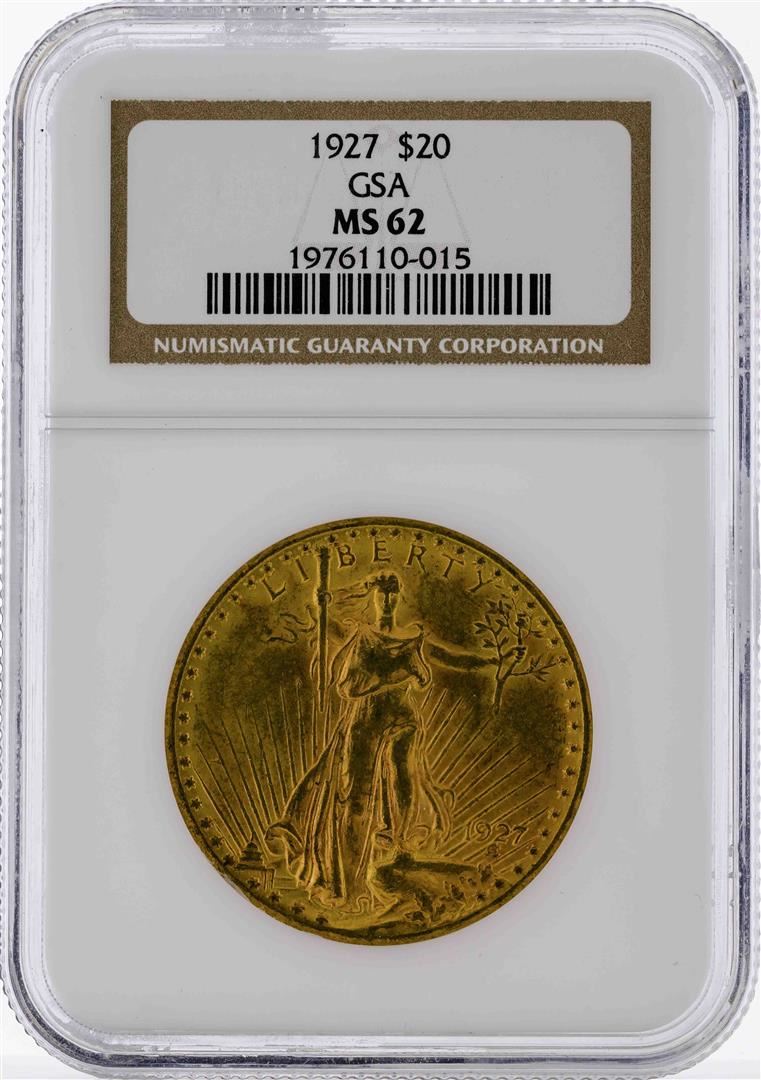 One 1927 $20 St. Gaudens Double Eagle Gold Coin GSA NGC MS62. NGC Certified.