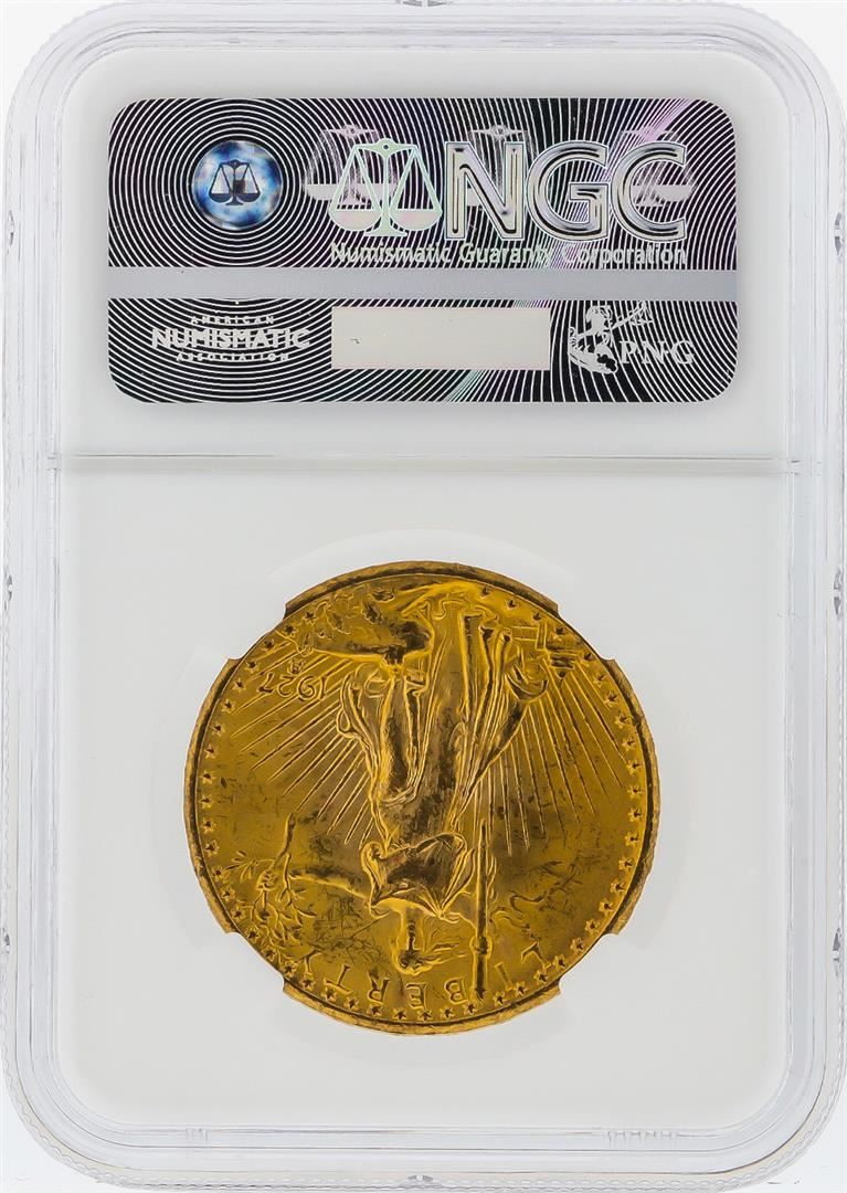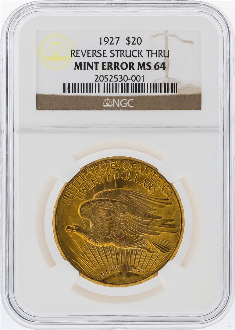 One 1927 $20 St. Gaudens Double Eagle Gold Coin Reverse Struck Thru Mint ERROR NGC Graded MS64. NGC Certified.