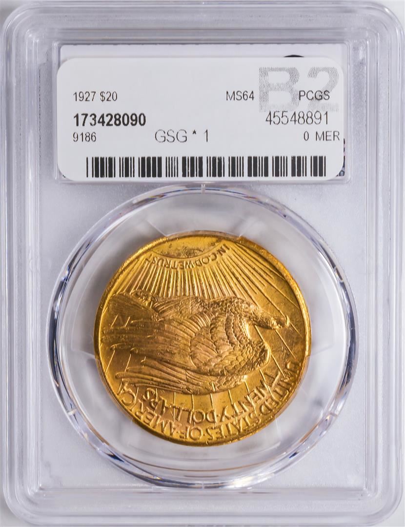 One 1927 $20 St. Gaudens Double Eagle Gold Coin PCGS MS64.