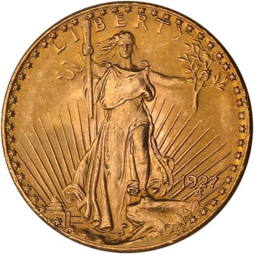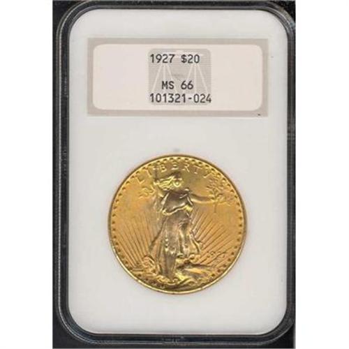 <b>1927 $20 St. Gaudens. NGC graded MS66.</b> NGC Pop: 1455. A nice dusting of flaming golden luster covers the surface. Well struck on all devices <b>(PCGS # 9186)</b> <i>