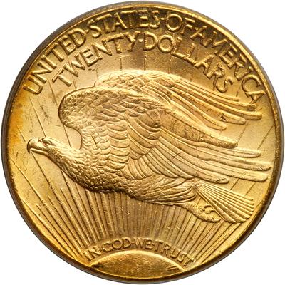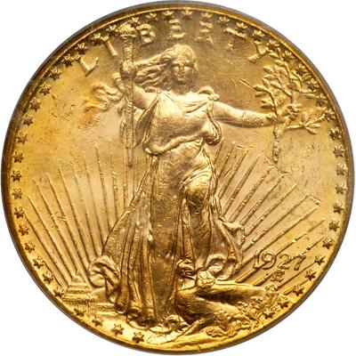 1927 $20 St. Gaudens. PCGS graded MS-63. Light golden toning. A few normal bagmarks. Extra crisp detail on all relief portions (PCGS # 9186).