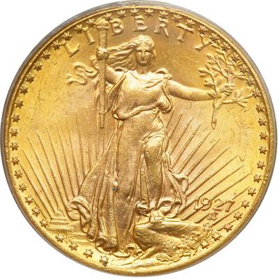 1927 $20 St. Gaudens. PCGS graded MS-63. Exhibits nice golden toning on both sides with flashy luster throughout (PCGS # 9186).