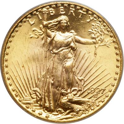 1927 $20 St. Gaudens. PCGS graded MS-64 PQ. Intense lustrous surfaces. Premium quality for the grade (PCGS # 9186) .