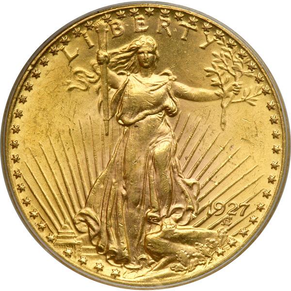 1927 $20 St. Gaudens. PCGS graded MS-64. Lightly toned, the surface beams with golden color (PCGS # 9186) .