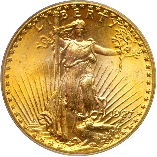 1927. PCGS graded MS-66. A gem displaying full mint bloom brilliance. Struck with all the energy and conviction of the dies as intended by the Philadelphia Mint pressman responsible for its issue. Very few survivors could possibly equal the almost superb technical merits and originality of this 1927. In addition to its strong strike and nearly flawless surface quality, both sides are gleaming with mint brilliance (PCGS # 9186) .