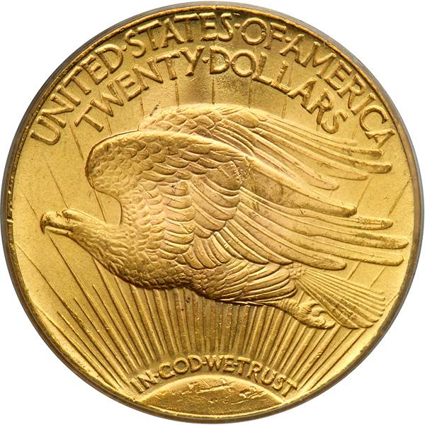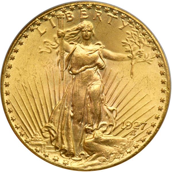 1927 $20 St. Gaudens. PCGS graded MS-65. A boldly struck golden gem, lustrous, gleaming. What did things cost in 1927? The fare to Bermuda from New York and back by ship was $70 (or three and a half $20 gold pieces). This price included the berth and meals. A new Hudson automobile cost $1,250 or a little more than 60 double eagles at the time, which equates in today's mini-dollar of $1,100 gold to an awful lot of money! You get a feel for the actual buying power of gold money like this 1927 (PCGS # 9186) .