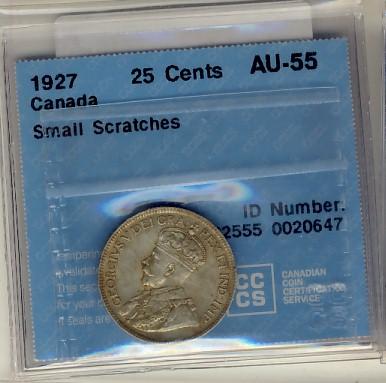 1927 25¢ CCCS AU55 designated with small scratches. Key issue.