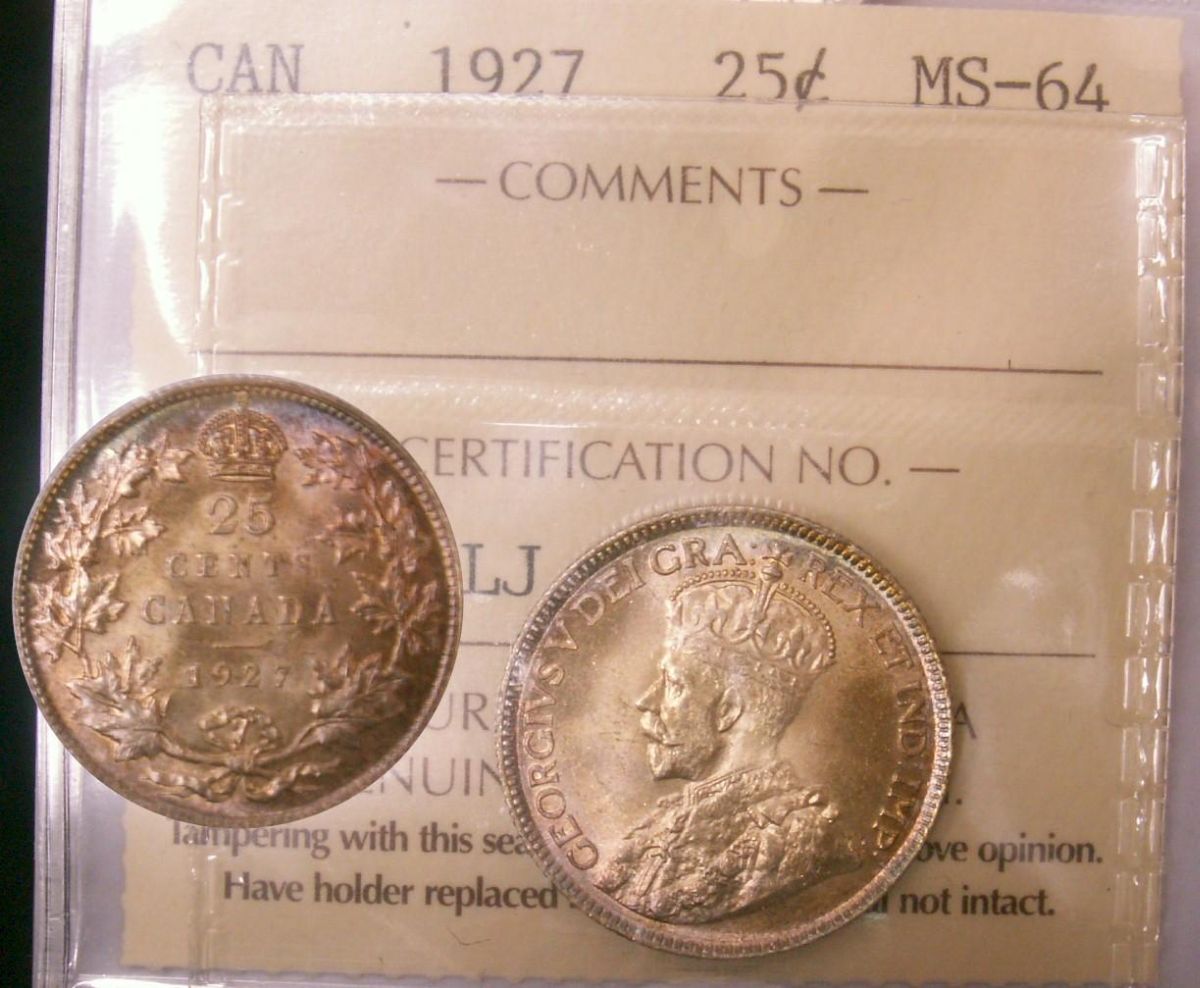 1927 25¢ ICCS MS64. Beautiful rainbow tone and fully lustered.