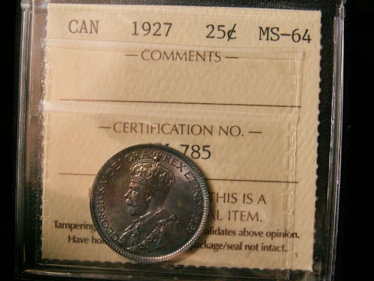 1927 25¢ ICCS MS64. Intense bluish tones over full underlying lustre. Excellent strike with clean fields and nice surfaces.
