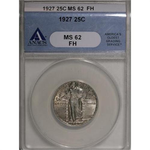 <B>1927 25C MS62 Full Head ANACS.</B></I> NGC Census: (57/324). PCGS Population (74/463). Mintage: 11,912,000. Numismedia Wsl. Price for NGC/PCGS coin in MS62: $225. (#5761)<BR><BR><B>Coin Engraver:</B> Hermon A. MacNeil<BR><BR><b>Shipping:</b> Coins & Currency (<a target="_blank" href="http://www.heritageauctions.com/common/shipping.php">view shipping information</a>)