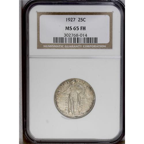 <B>1927<25C> MS65 Full Head NGC.</B></I> Lustrous surfaces are visited by whispers of olive-tan and gold, and the design elements are sharply impressed. We do mention that a couple of the rivets near Liberty's body are weak. A few minute marks are noted in the right (facing) reverse field. Census: 61 in 65, 29 finer (2/06).<BR><I>From The Frank DuVall Collection.</B></I>