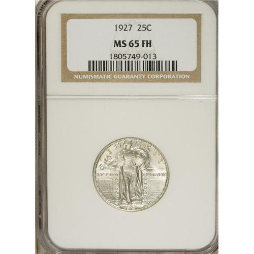 <B>1927 25C MS65 Full Head NGC.</B></I> Solidly struck overall with only a touch of softness on the often-weak rivets of the shield. A touch of ice-blue patina graces shining and otherwise untoned surfaces, and the fields display just a handful of faint marks consistent with the grade. A great example of this Recessed Date issue.<BR><BR><b>Shipping:</b> Coins & Currency (<a target="_blank" href="http://www.heritageauctions.com/common/shipping.php">view shipping information</a>)