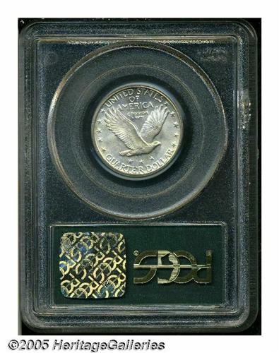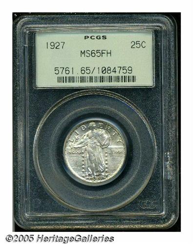 <B>1927<25C> MS65 Full Head PCGS.</B></I> The strike is sharp, not only on Liberty's head, but on her waist and shield rivets as well. The date is also bold. Light apricot and sky-gray colors do not conceal the blazing luster. A minor mark on the inner shield and a small spot on the back wing. In a green label holder.<BR><I>From The Clifford Columbus Collection.</B></I>