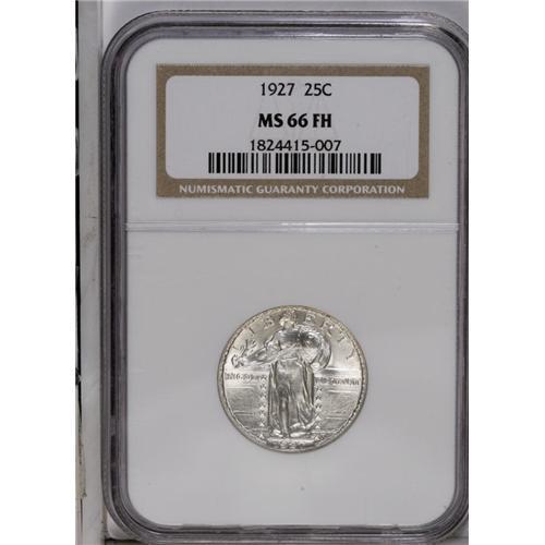 <B>1927<25C> MS66 Full Head NGC.</B></I> A brilliant and seemingly immaculate coin with excellent luster and great detail. An excellent type coin. Census: 28 in 66 FH, 2 finer (7/06).<BR><I>From The Brevard Gold & Silver Former #2 NGC Registry of Standing Liberty Quarters.</B></I>
