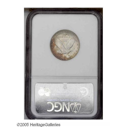 <B>1927<25C> MS66 Full Head NGC.</B></I> A lovely, high grade type coin that is virtually flawless. The thick mint frost is covered with silver-gray toning on each side and selected peripheral areas show varying shades of olive-green, russet, crimson-red, and antique-gold. An original coin of great beauty.