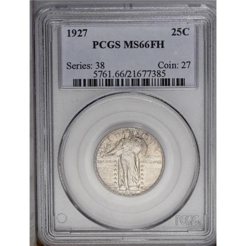 <B>1927 25C MS66 Full Head PCGS.</B></I> Both sides of this strictly graded Premium Gem offer attractive, streaky lilac and dove-gray toning, with considerable luster emanating from beneath. The head details are extremely bold, as expected, and the shield rivets are present, but the shield lines are nearly nonexistent. The eagle's right (facing) wing is also a bit soft, but the overall superior eye appeal and a notable lack of abrasions compensate.