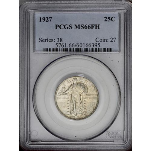 <B>1927<25C> MS66 Full Head PCGS.</B></I> Well struck with near blemish-free surfaces. Pale obverse toning turns to streaky russet-brown patina on the right side. The reverse exhibits a steel-blue and red-orange splash near the lower left border. Population: 40 in 66 Full Head, 5 finer (3/06).