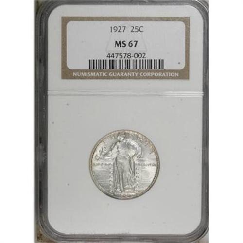 <B>1927 25C MS67 NGC.</B></I> Pastel ice-blue and honey-gold tints enrich this lustrous and unabraded Superb Gem. Liberty's cheek is incomplete, but the strike is sharp on the date and the eagle's breast. A nearly imperceptible fingerprint is noted at 9 o'clock on the reverse. Census: 2 in 67, 0 finer (6/07).<BR><BR><b>Shipping:</b> Coins & Currency (<a target="_blank" href="http://www.heritageauctions.com/common/shipping.php">view shipping information</a>)