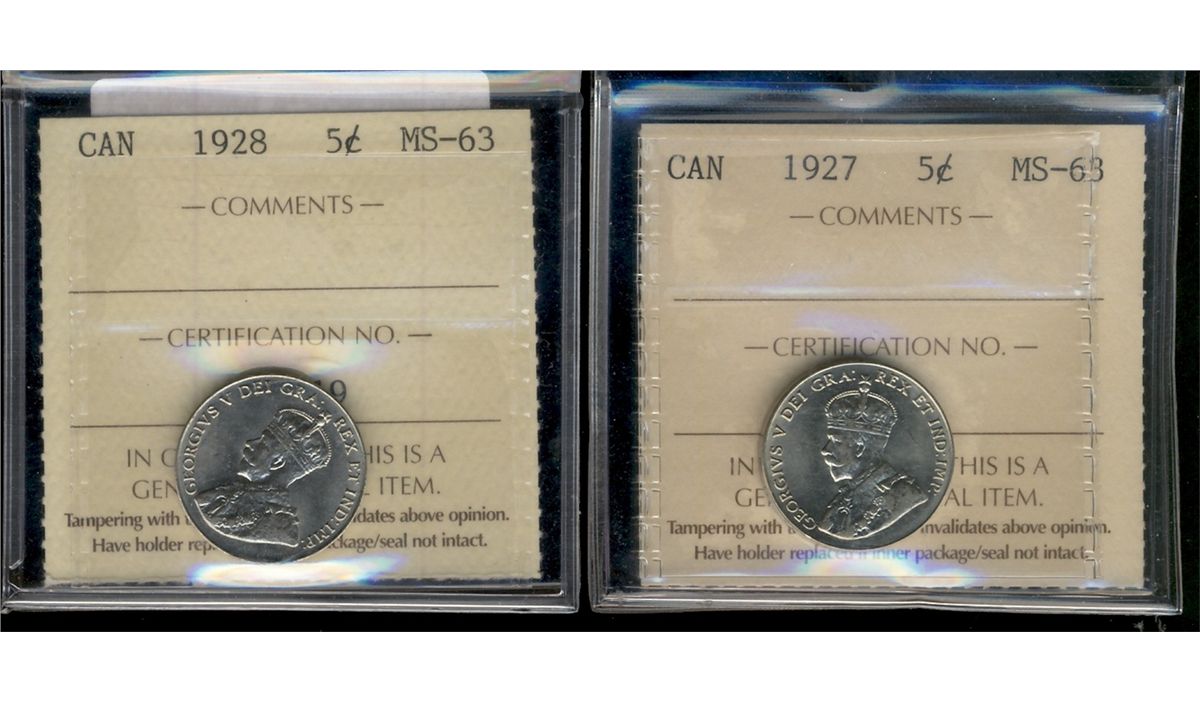 1927 5¢ & 1928 ICCS MS63. Lot of 2 coins.