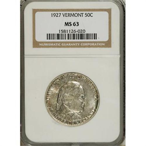 <B>1927 50C Vermont MS63 NGC.</B></I> NGC Census: (360/1991). PCGS Population (924/2412). Mintage: 28,142. Numismedia Wsl. Price for NGC/PCGS coin in MS63: $224. (#9401)<BR><BR><b>Shipping:</b> Coins & Currency (<a target="_blank" href="http://www.heritageauctions.com/common/shipping.php">view shipping information</a>)