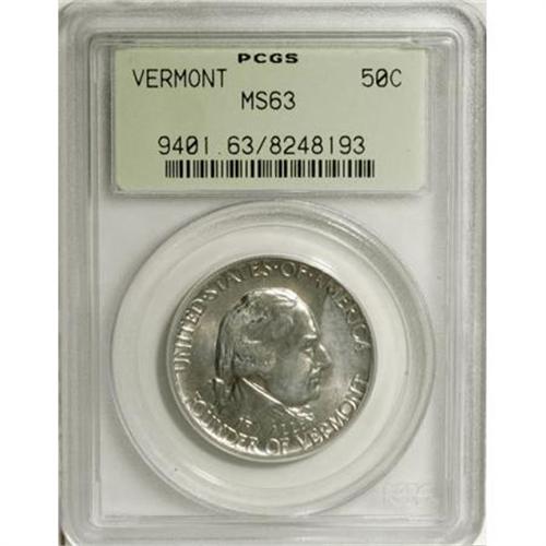 <B>1927 50C Vermont MS63 PCGS.</B></I> PCGS Population (922/2399). NGC Census: (360/1991). Mintage: 28,142. Numismedia Wsl. Price for NGC/PCGS coin in MS63: $224. (#9401)<BR><BR><b>Shipping:</b> Coins & Currency (<a target="_blank" href="http://www.heritageauctions.com/common/shipping.php">view shipping information</a>)