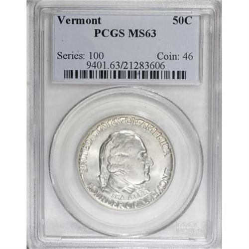 <B>1927 50C Vermont MS63 PCGS.</B></I> PCGS Population (926/2435). NGC Census: (365/2006). Mintage: 28,142. Numismedia Wsl. Price for NGC/PCGS coin in MS63: $224. (#9401)<BR><BR><b>Shipping:</b> Coins & Currency (<a target="_blank" href="http://www.heritageauctions.com/common/shipping.php">view shipping information</a>)