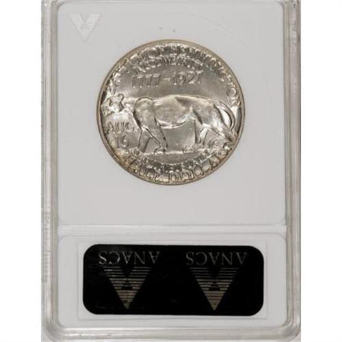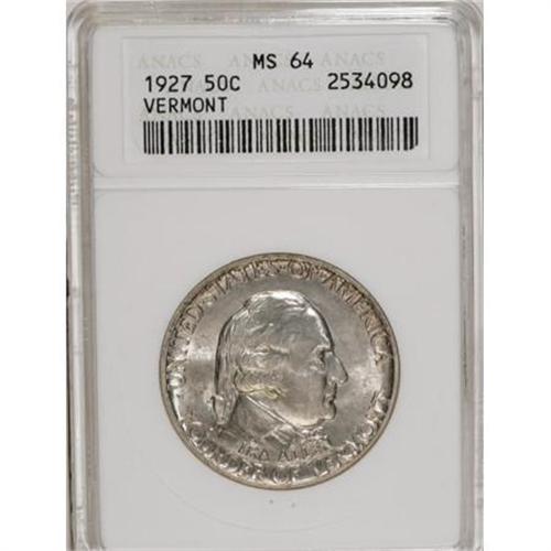 <B>1927 50C Vermont MS64 ANACS.</B></I> NGC Census: (1121/888). PCGS Population (1348/1100). Mintage: 28,142. Numismedia Wsl. Price for NGC/PCGS coin in MS64: $280. (#9401)<BR><BR><b>Shipping:</b> Coins & Currency (<a target="_blank" href="http://www.heritageauctions.com/common/shipping.php">view shipping information</a>)