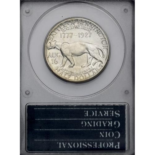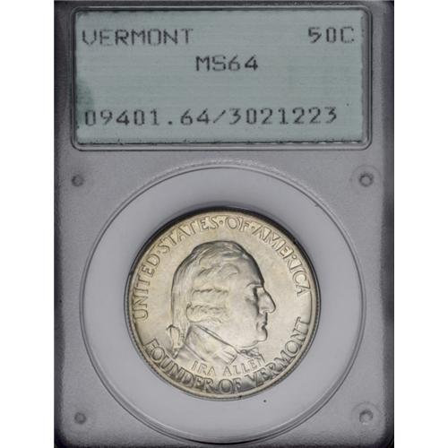 <B>1927<50C> Vermont MS64 PCGS.</B></I> Smooth lustrous surfaces display whispers of light tan color and sharply impressed motifs. A greenish spot is noted on the top of Allen's collar. Housed in a first generation PCGS holder. <BR><BR><B>Important notice:</B> Heritage usually auctions material at the rate of 200-250 lots per hour. On some occasions eBay Live bid software or the Internet may not be able to keep up with the pace of the auction. We recommend placing a realistic absentee bid now as insurance to avoid disappointment. Occasionally the auctioneer may eliminate or reject an eBay Live bid, and the auctioneer may also reopen a lot after the close of the eBay live bidding (usually because we missed an audience bid), and may reject your bid even if it shows you as the winning bidder. By bidding via eBay Live, you agree that Heritage may award the lot to another bidder at its sole discretion under the circumstances described above or any other reasonable circumstances. Since eBay bids are not shown to us until we open the lot on the floor, we treat those bids just like floor bids. In most cases the floor responds before the eBay bid is presented to us, due to Internet lag time, so for consistency we have made it a policy that floor bids are always considered first over tie eBay live bids. Also please note that all Heritage lots purchased through eBay Live carry a 20% Buyer's Premium. Please make sure you read the Terms and Conditions before you bid. This lot is being auctioned in conjunction with a live floor auction by Heritage Galleries & Auctioneers. All final auction and invoice information will be supplied by Heritage Galleries & Auctioneers, and all other information should be considered preliminary. Lot:5110 <BR><BR><B>Winning Notification and Billing:</B> After the FINAL session in this auction is complete, Heritage will send e-mail and snail mail invoices. This process normally takes several days. All final auction and invoice information will be supplied by Heritage Galleries & Auctioneers, and all other information should be considered preliminary. <BR><BR>This auction will be conducted on a live auction floor and over the Internet through eBay Live. If you choose to place an absentee bid, please take a moment to <font color='#0000ff'><u><a href='http://pages.ebay.com/liveauctions/help/before/laabsentee.html'>learn how eBay Live absentee bidding works</a></u></font><font color='#000000'>