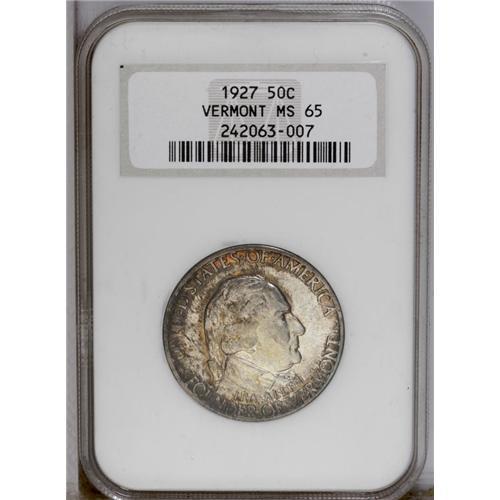 <B>1927<50C> Vermont MS65 NGC.</B></I> Whispers of reddish brown and russet toning cover parts of this mostly mark free specimen. Both sides display pleasing luster and exhibit sharply defined motifs.