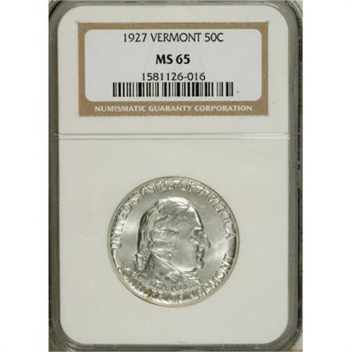 <B>1927 50C Vermont MS65 NGC.</B></I> NGC Census: (710/174). PCGS Population (800/286). Mintage: 28,142. Numismedia Wsl. Price for NGC/PCGS coin in MS65: $800. (#9401)<BR><BR><b>Shipping:</b> Coins & Currency (<a target="_blank" href="http://www.heritageauctions.com/common/shipping.php">view shipping information</a>)