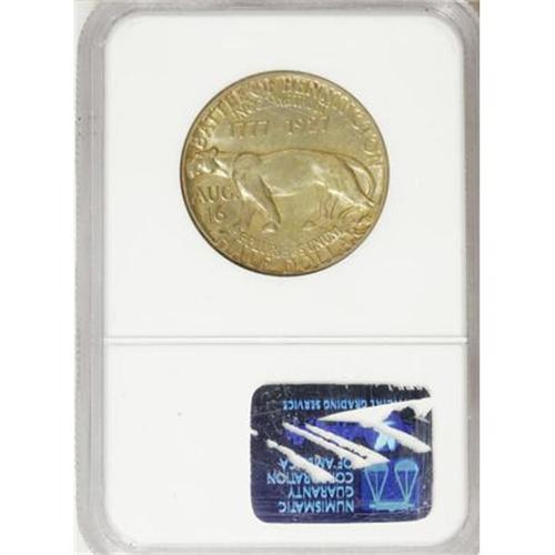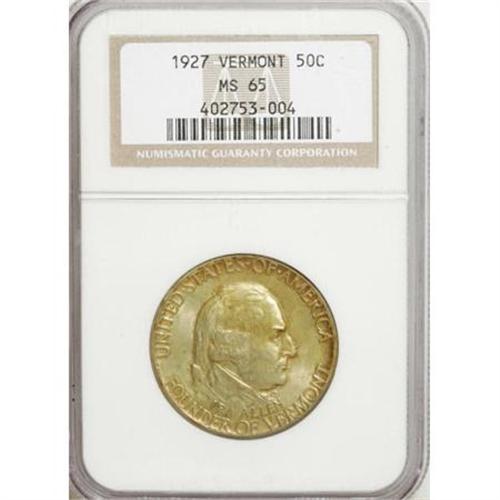 <B>1927 50C Vermont MS65 NGC.</B></I> Deep yellow-bronze patina drapes much of this shining Gem, while elements of green and rose appear at the margins. A pleasingly detailed example of this Revolution-interest commemorative issue.<BR><BR><b>Shipping:</b> Coins & Currency (<a target="_blank" href="http://www.heritageauctions.com/common/shipping.php">view shipping information</a>)