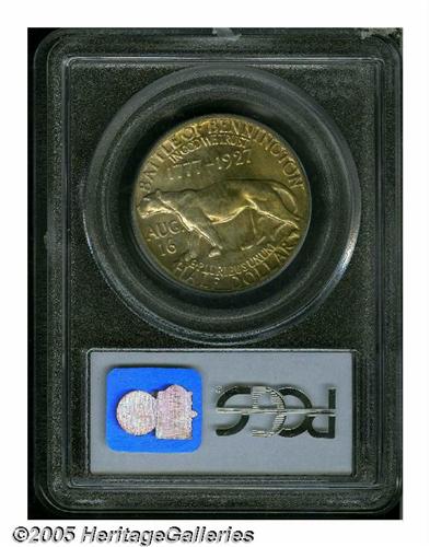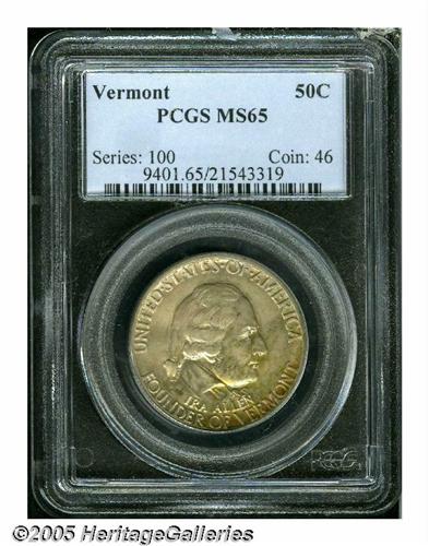 <B>1927<50C> Vermont MS65 PCGS.</B></I> An attractive example of this scarcer commemorative, the surfaces are highly lustrous and covered with tan-gold patina. A couple of moderate contact marks are noticeable on the obverse.