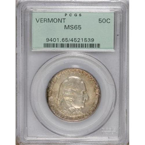 <B>1927 50C Vermont MS65 PCGS.</B></I> An impressive Gem whose light golden-brown surfaces are both smooth and lustrous. The strike is sharp, as usual for the type despite its uncommonly high relief. Encased in a green label holder.<BR><BR><b>Shipping:</b> Coins & Currency (<a target="_blank" href="http://www.heritageauctions.com/common/shipping.php">view shipping information</a>)