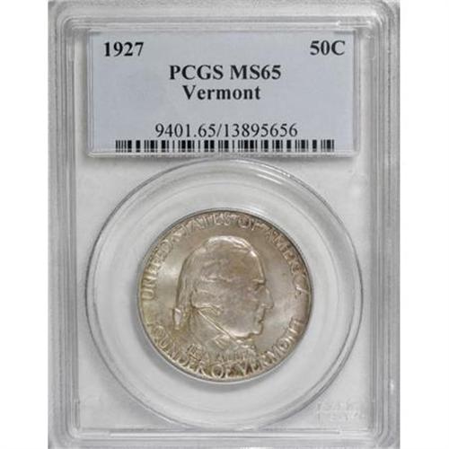 <B>1927 50C Vermont MS65 PCGS.</B></I> PCGS Population (789/282). NGC Census: (704/174). Mintage: 28,142. Numismedia Wsl. Price for NGC/PCGS coin in MS65: $800. (#9401)<BR><I>From The Frank DuVall Collection of U.S. Commemoratives.</B></I><BR><BR><b>Shipping:</b> Coins & Currency (<a target="_blank" href="http://www.heritageauctions.com/common/shipping.php">view shipping information</a>\)