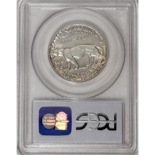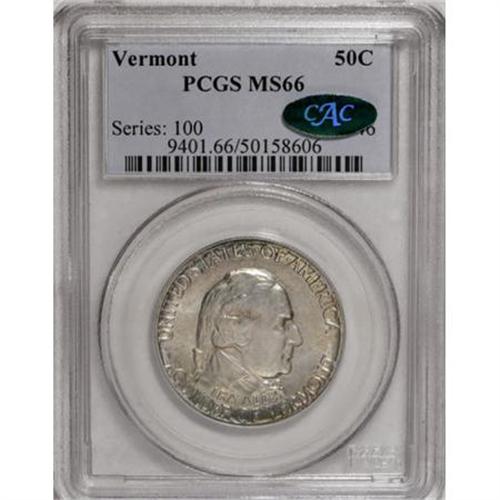 <B>1927 50C Vermont MS66 PCGS. CAC.</B></I> The lustrous centers are powder-gray and silver-gold, with a periphery of sky-blue and amber-gold. An appealing piece, well struck and seemingly pristine. The reverse is rotated about 15 degrees counterclockwise with respect to the obverse. PCGS has certified only 21 coins finer (1/08).<BR><I>From The Southwest Collection.</B></I><BR><BR><b>Shipping:</b> Coins & Currency (<a target="_blank" href="http://www.heritageauctions.com/common/shipping.php">view shipping information</a>)