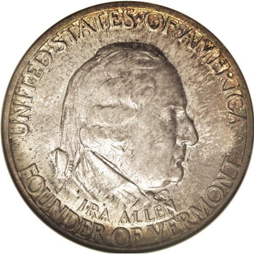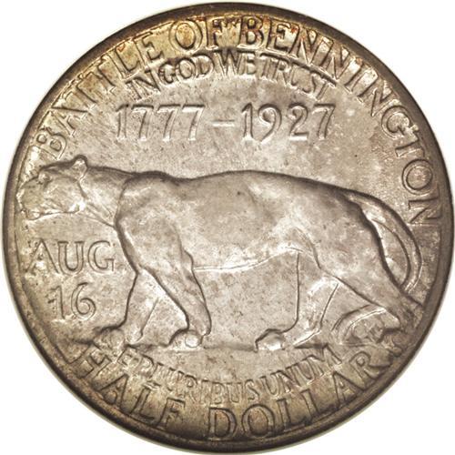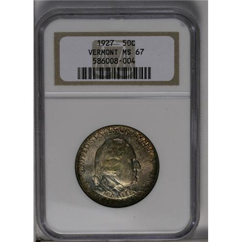 <B>1927<50C> Vermont MS67 NGC.</B></I> Mottled shadings of smoky-tan and sunset-golden patina are seen on each side, none of which interferes with the thick mint luster. The strike is excellent, and the fields are almost completely free of abrasions. Census: 17 in 67, 2 finer (6/06).