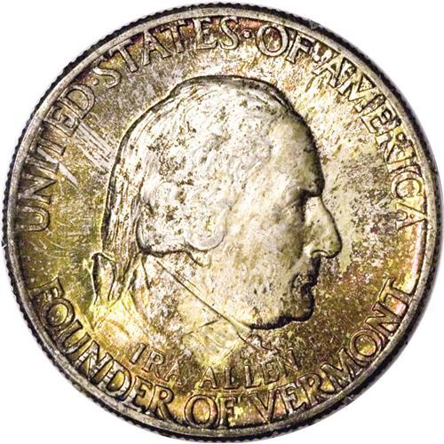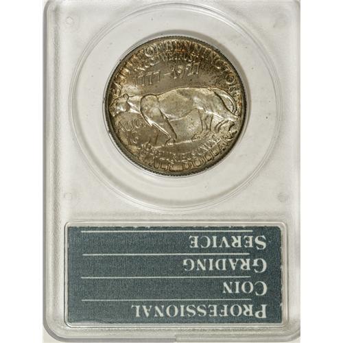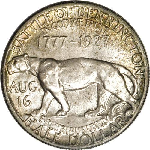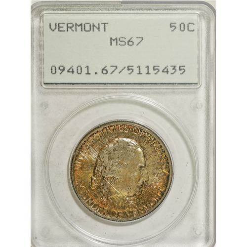 <B>1927 50C Vermont MS67 PCGS.</B></I> Linking the lynx on the reverse of the Vermont half with the Catamount Tavern, a famous meeting place for revolutionaries of that state, and thence to Ira Allen and the Green Mountain Boys proved too much for many numismatists, and the visual pun goes down as one of the most obscure in American commemorative history. The practically flawless surfaces display powerful luster beneath dappled russet and apple-green toning on the obverse, though such patina appears only at the margins on the reverse. This highly appealing piece is tied for the finest certified by PCGS and is housed in a first-generation holder (3/07).<BR><I>From The Cary & Cheryl Porter Collection.</B></I><BR><BR><b>Shipping:</b> Coins & Currency (<a target="_blank" href="http://www.heritageauctions.com/common/shipping.php">view shipping information</a>)