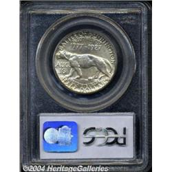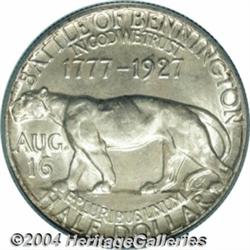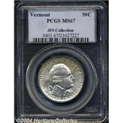 <B>1927<50C> Vermont MS67 PCGS.</B></I> Hints of apricot and gunmetal-blue color grace this flashy and carefully preserved half dollar. Boldly struck, since the centers and peripheral legends offer only the barest indication of less than a complete blow from the dies. An available type in MS63 to MS65 grades, but premium Gems are scarce and few survivors can equal the stellar quality of the present Superb Gem. Population: 18 in 67, none finer (6/04).<BR><I>Ex: FUN Signature Sale (Heritage, 1/02), lot 8932, which realized $4,830.</B></I><BR><I>From the JFS Collection, the #1 All-Time PCGS Registry Set.</B></I> <BR><BR><B>Important notice:</B> Heritage usually auctions material at the rate of 200-250 lots per hour. On some occasions eBay Live bid software or the Internet may not be able to keep up with the pace of the auction. We recommend placing a realistic absentee bid now as insurance to avoid disappointment. Occasionally the auctioneer may eliminate or reject an eBay Live bid, and the auctioneer may also reopen a lot after the close of the eBay live bidding (usually because we missed an audience bid), and may reject your bid even if it shows you as the winning bidder. By bidding via eBay Live, you agree that Heritage may award the lot to another bidder at its sole discretion under the circumstances described above or any other reasonable circumstances. Since eBay bids are not shown to us until we open the lot on the floor, we treat those bids just like floor bids. In most cases the floor responds before the eBay bid is presented to us, due to Internet lag time, so for consistency we have made it a policy that floor bids are always considered first over tie eBay live bids. Also please note that all Heritage lots purchased through eBay Live carry a 20% Buyer's Premium. Please make sure you read the Terms and Conditions before you bid. </span></font></tr></table></td></tr></table>
