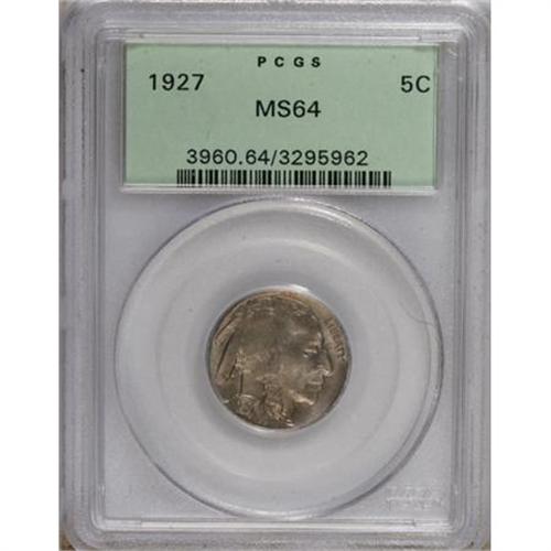 <B>1927 5C MS64 PCGS.</B></I> PCGS Population (530/840). NGC Census: (297/330). Mintage: 37,981,000. Numismedia Wsl. Price for NGC/PCGS coin in MS64: $84. (#3960)<BR><BR><B>Coin Engraver:</B> James E. Fraser<BR><BR><b>Shipping:</b> Coins & Currency (<a target="_blank" href="http://www.heritageauctions.com/common/shipping.php">view shipping information</a>)