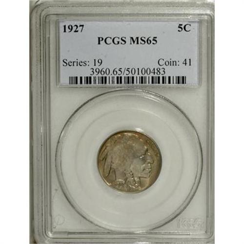<B>1927 5C MS65 PCGS.</B></I> PCGS Population (595/251). NGC Census: (256/73). Mintage: 37,981,000. Numismedia Wsl. Price for NGC/PCGS coin in MS65: $232. (#3960)<BR><BR><B>Coin Engraver:</B> James E. Fraser<BR><BR><b>Shipping:</b> Coins & Currency (<a target="_blank" href="http://www.heritageauctions.com/common/shipping.php">view shipping information</a>)