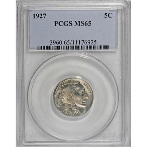 <B>1927 5C MS65 PCGS.</B></I> PCGS Population (596/255). NGC Census: (256/73). Mintage: 37,981,000. Numismedia Wsl. Price for NGC/PCGS coin in MS65: $232. (#3960)<BR><BR><B>Coin Engraver:</B> James E. Fraser<BR><BR><b>Shipping:</b> Coins & Currency (<a target="_blank" href="http://www.heritageauctions.com/common/shipping.php">view shipping information</a>)
