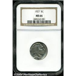 <B>1927<5C> MS66 NGC.</B></I> A premium Gem Buffalo with soft silver-gray patina, abundant luster, needle-sharp strike detail, and nearly flawless surfaces. Population: 64 in 66, 3 finer (9/04). <BR><BR><B>Important notice:</B> Heritage usually auctions material at the rate of 200-250 lots per hour. On some occasions eBay Live bid software or the Internet may not be able to keep up with the pace of the auction. We recommend placing a realistic absentee bid now as insurance to avoid disappointment. Occasionally the auctioneer may eliminate or reject an eBay Live bid, and the auctioneer may also reopen a lot after the close of the eBay live bidding (usually because we missed an audience bid), and may reject your bid even if it shows you as the winning bidder. By bidding via eBay Live, you agree that Heritage may award the lot to another bidder at its sole discretion under the circumstances described above or any other reasonable circumstances. Since eBay bids are not shown to us until we open the lot on the floor, we treat those bids just like floor bids. In most cases the floor responds before the eBay bid is presented to us, due to Internet lag time, so for consistency we have made it a policy that floor bids are always considered first over tie eBay live bids. Also please note that all Heritage lots purchased through eBay Live carry a 20% Buyer's Premium. Please make sure you read the Terms and Conditions before you bid.