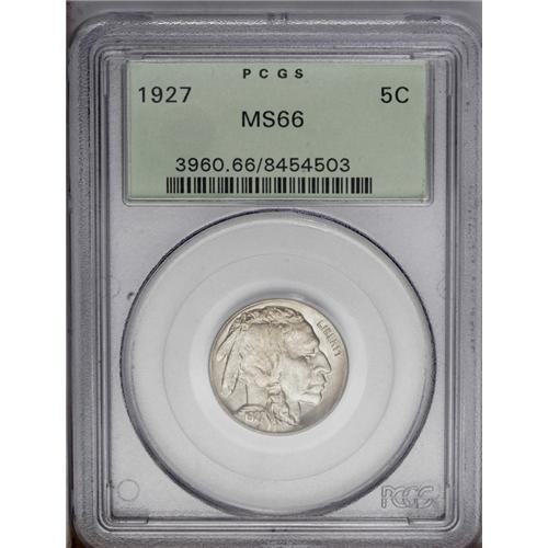 <B>1927<5C> MS66 PCGS.</B></I> A crisply struck and beautifully undisturbed chestnut-gray Premium Gem. Ice-blue toning outlines the front legs. Housed in a green label holder. <BR><BR><B>Important notice:</B> Heritage usually auctions material at the rate of 200-250 lots per hour. On some occasions eBay Live bid software or the Internet may not be able to keep up with the pace of the auction. We recommend placing a realistic absentee bid now as insurance to avoid disappointment. Occasionally the auctioneer may eliminate or reject an eBay Live bid, and the auctioneer may also reopen a lot after the close of the eBay live bidding (usually because we missed an audience bid), and may reject your bid even if it shows you as the winning bidder. By bidding via eBay Live, you agree that Heritage may award the lot to another bidder at its sole discretion under the circumstances described above or any other reasonable circumstances. Since eBay bids are not shown to us until we open the lot on the floor, we treat those bids just like floor bids. In most cases the floor responds before the eBay bid is presented to us, due to Internet lag time, so for consistency we have made it a policy that floor bids are always considered first over tie eBay live bids. Also please note that all Heritage lots purchased through eBay Live carry a 20% Buyer's Premium. Please make sure you read the Terms and Conditions before you bid. This lot is being auctioned in conjunction with a live floor auction by Heritage Galleries & Auctioneers. All final auction and invoice information will be supplied by Heritage Galleries & Auctioneers, and all other information should be considered preliminary. Lot:1097 <BR><BR><B>Winning Notification and Billing:</B> After the FINAL session in this auction is complete, Heritage will send e-mail and snail mail invoices. This process normally takes several days. All final auction and invoice information will be supplied by Heritage Galleries & Auctioneers, and all other information should be considered preliminary. <BR><BR>This auction will be conducted on a live auction floor and over the Internet through eBay Live. If you choose to place an absentee bid, please take a moment to <font color='#0000ff'><u><a href='http://pages.ebay.com/liveauctions/help/before/laabsentee.html'>learn how eBay Live absentee bidding works</a></u></font><font color='#000000'>