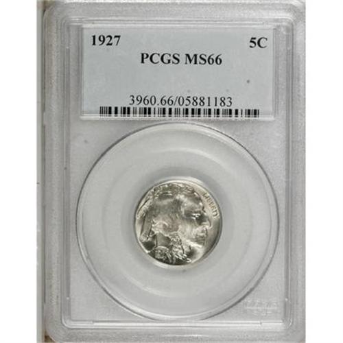 <B>1927 5C MS66 PCGS.</B></I> Potent luster emanates from the lightly toned surfaces of this Premium Gem that reveals just a couple of grade-consistent marks. Sharply struck throughout.<BR><BR><B>Coin Engraver:</B> James E. Fraser<BR><BR><b>Shipping:</b> Coins & Currency (<a target="_blank" href="http://www.heritageauctions.com/common/shipping.php">view shipping information</a>)