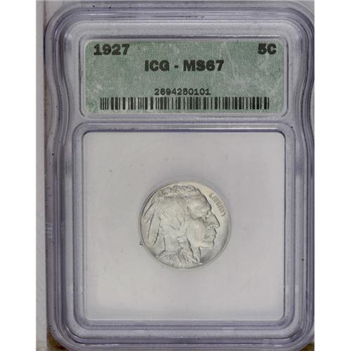 <B>1927<5C> MS67 ICG.</B></I> Crisply struck with lovely steel-green and olive toning over the lustrous, well preserved surfaces. An uncommonly high grade example of this otherwise common date.