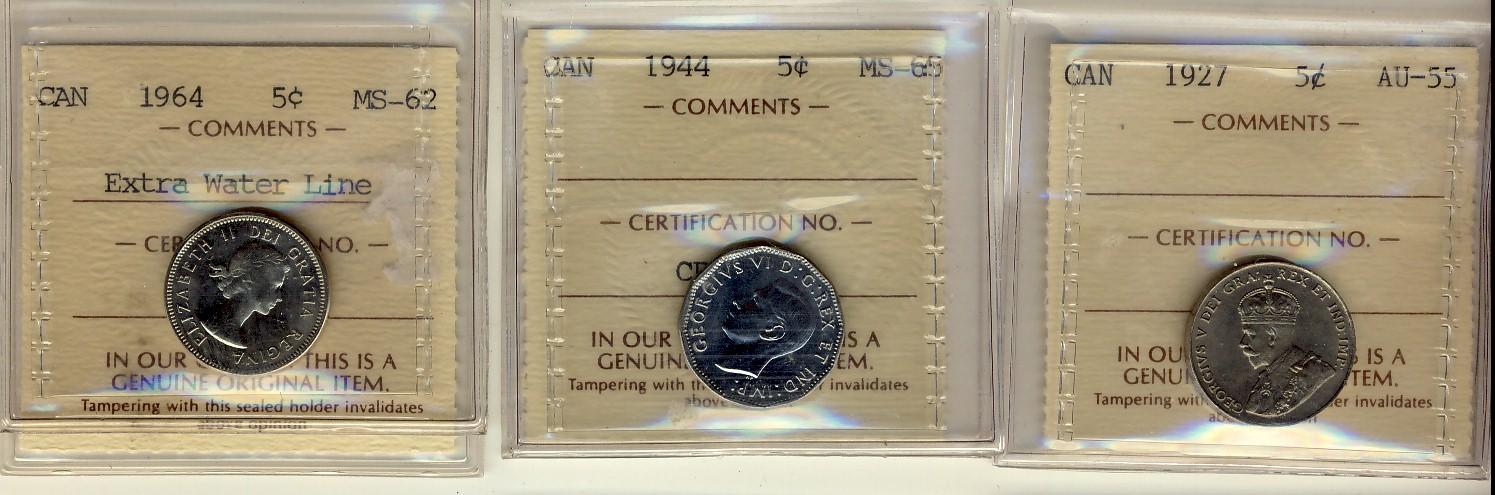 1927 AU55, 1944 MS65 & 1964 EWL 5¢ MS62. Lot of 3 ICCS graded coins.