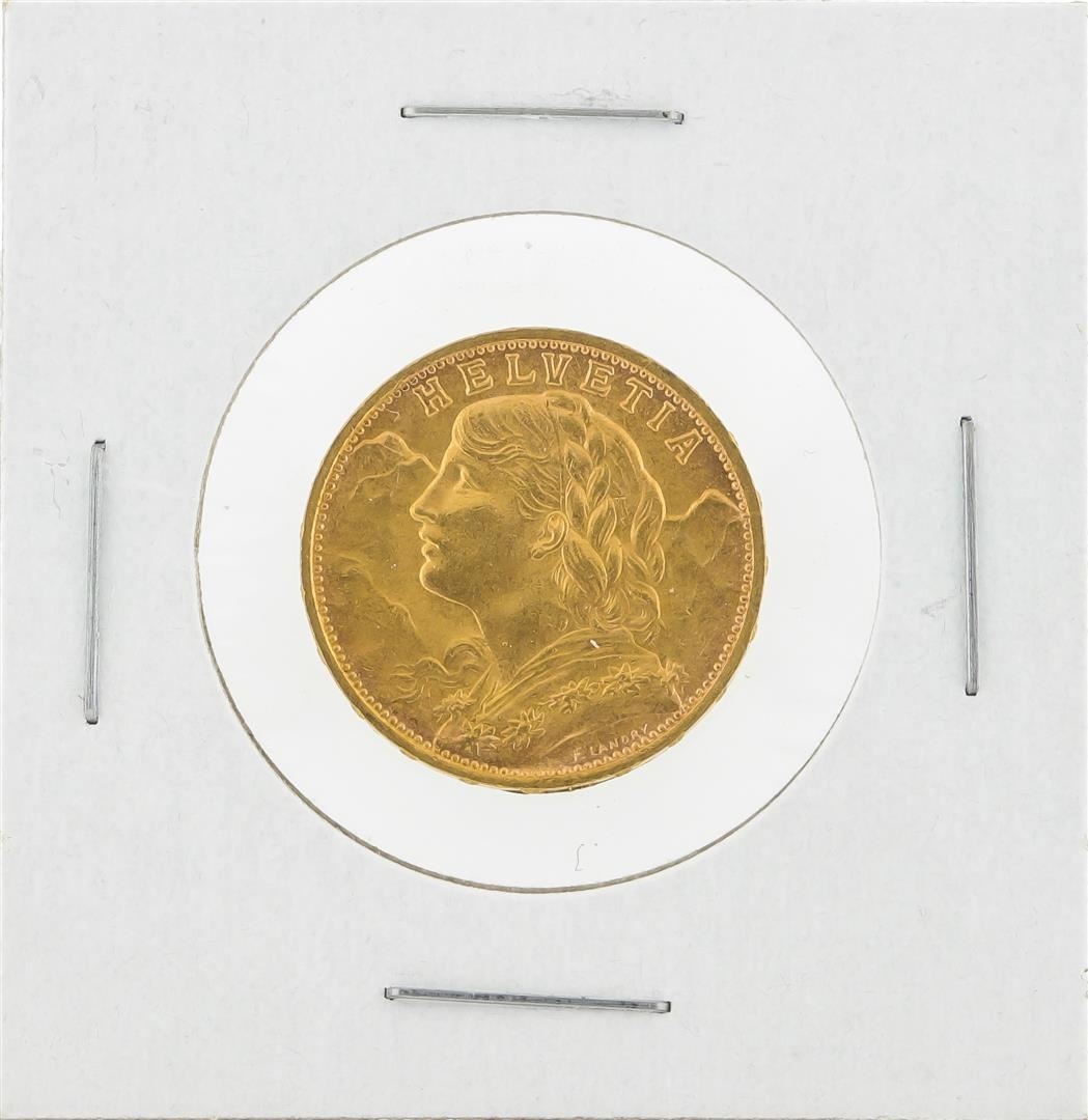 One 1927-B Swiss 20 Francs Helvetia Gold Coin.