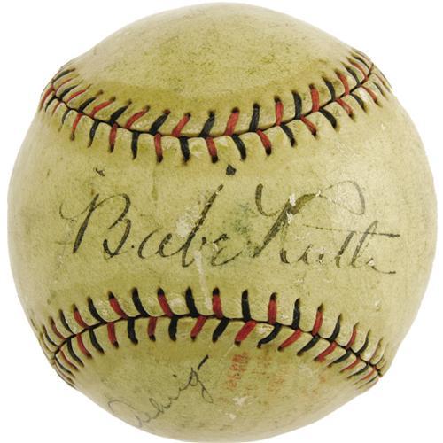 <B>1927 Babe Ruth & Lou Gehrig Signed Baseball.</B></I> While the tremendous visual quality of this autographed baseball is certain to appeal to all fans of the sport's most fearsome slugging duo, the true Yankee historian is bound to fall desperately in love for yet another reason. From the minor variation present in the stamping of this ONL (Heydler) ball, we are able to peg it definitively to the 1927 season. And why would Lou and the Babe be in the presence of a National League ball? The only logical conclusion is that the venue of the signing was Pittsburgh's Forbes Field on either October sixth or seventh, the dates of the first two games of the 1927 World Series. This relic from the absolute pinnacle of New York Yankees glory features a brilliantly bold black fountain pen sweet spot signature from the sixty home run hero, projecting at a boldness of 8.5/10, touched only by a minor degree of surface wear. Below him we find an 8/10 Lou Gehrig, the American League's Most Valuable Player. This remarkable quality is due in some degree to a coating of shellac, which has mellowed to a caramel tone, adding to the vintage patina of this delectable piece. <I>LOA from PSA/DNA. LOA from James Spence Authentication.</B></I><BR><BR><b>Shipping:</b> Balls, Pucks, etc., Small (<a target="_blank" href="http://www.heritageauctions.com/common/shipping.php">view shipping information</a>)